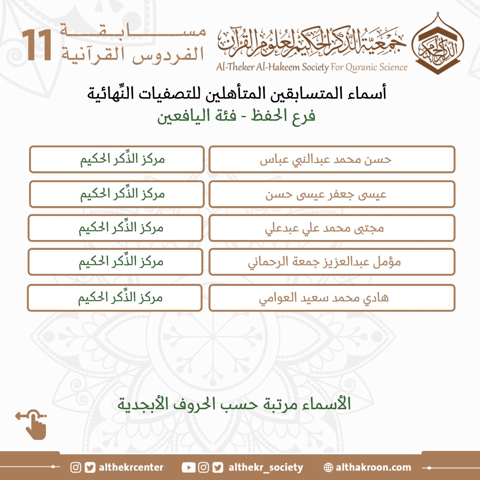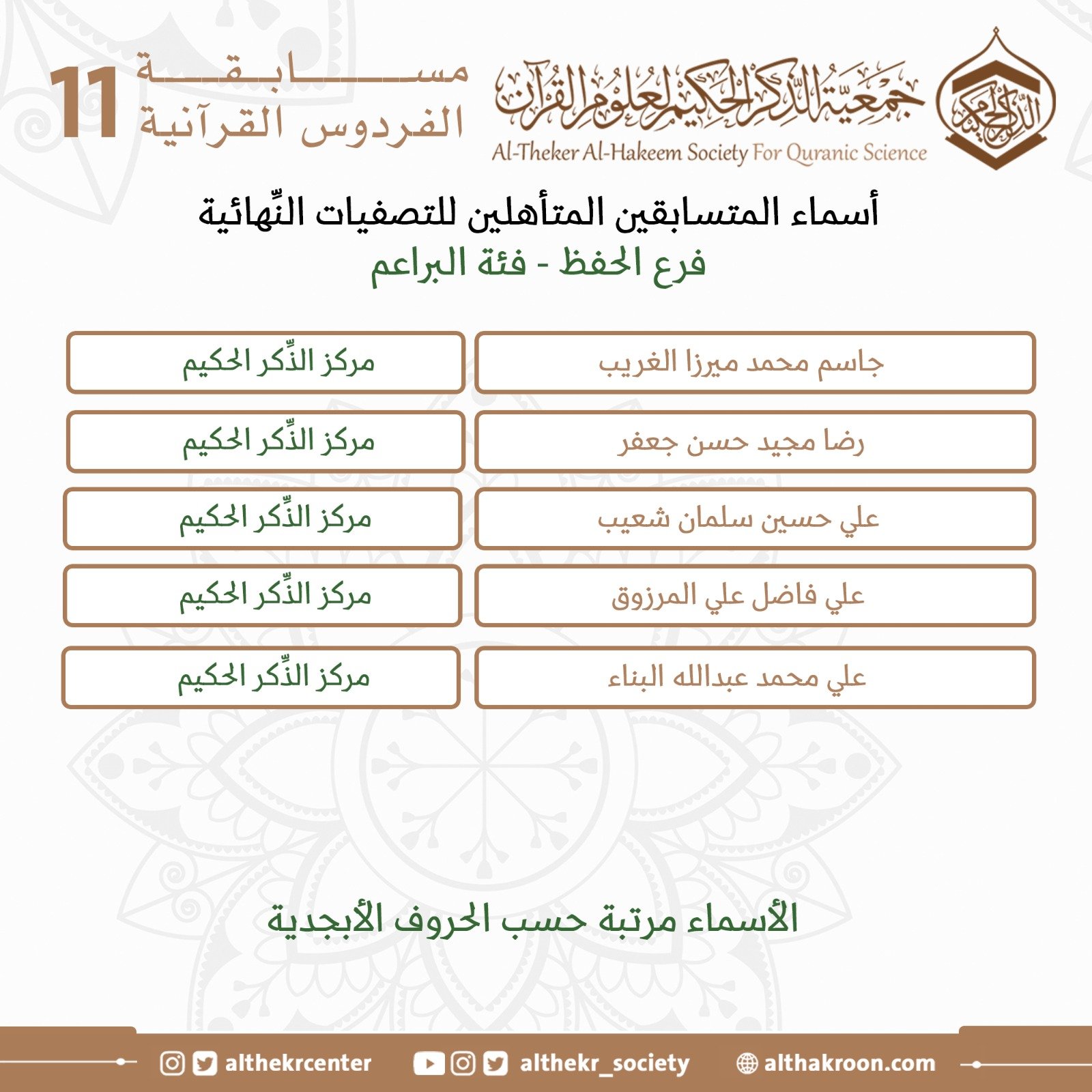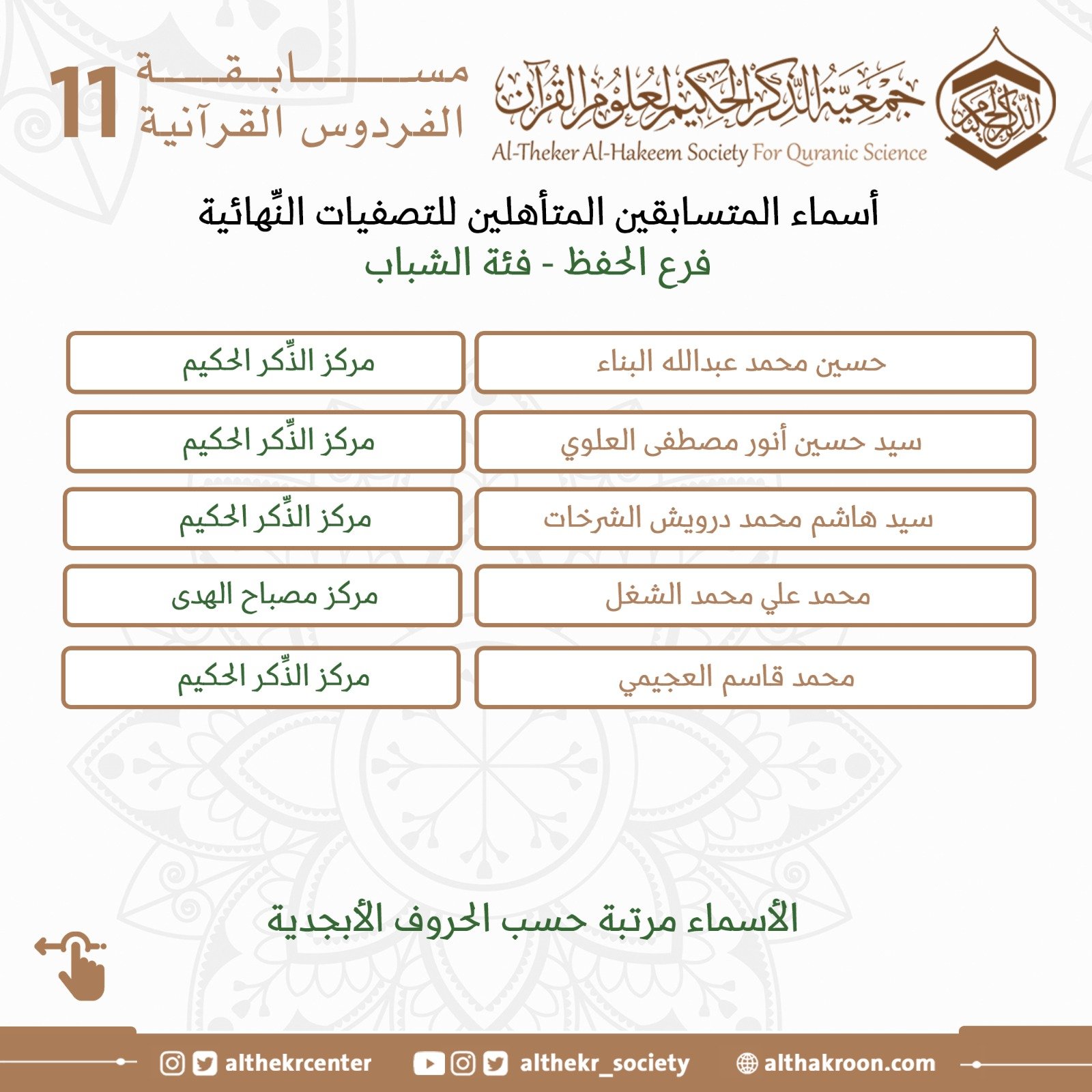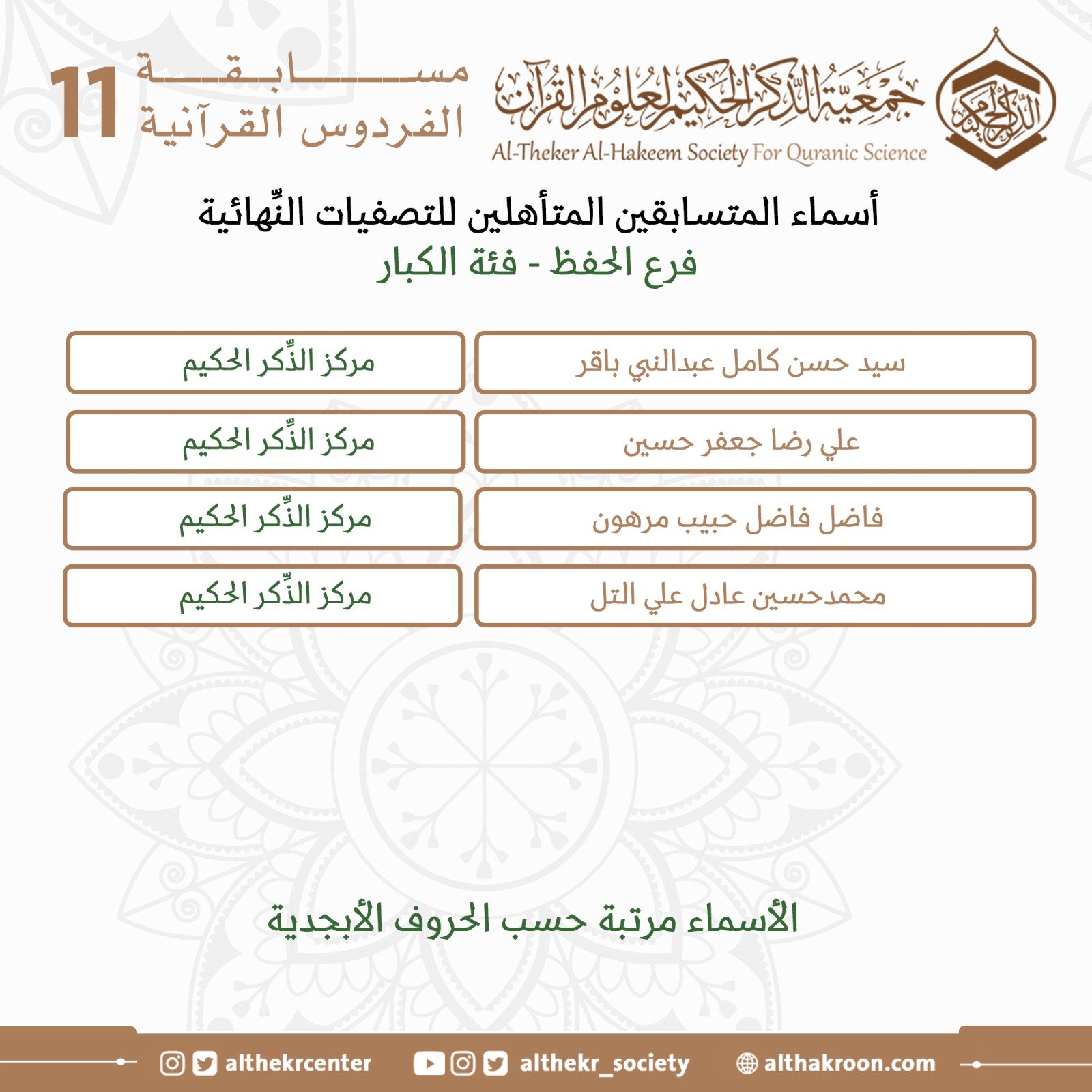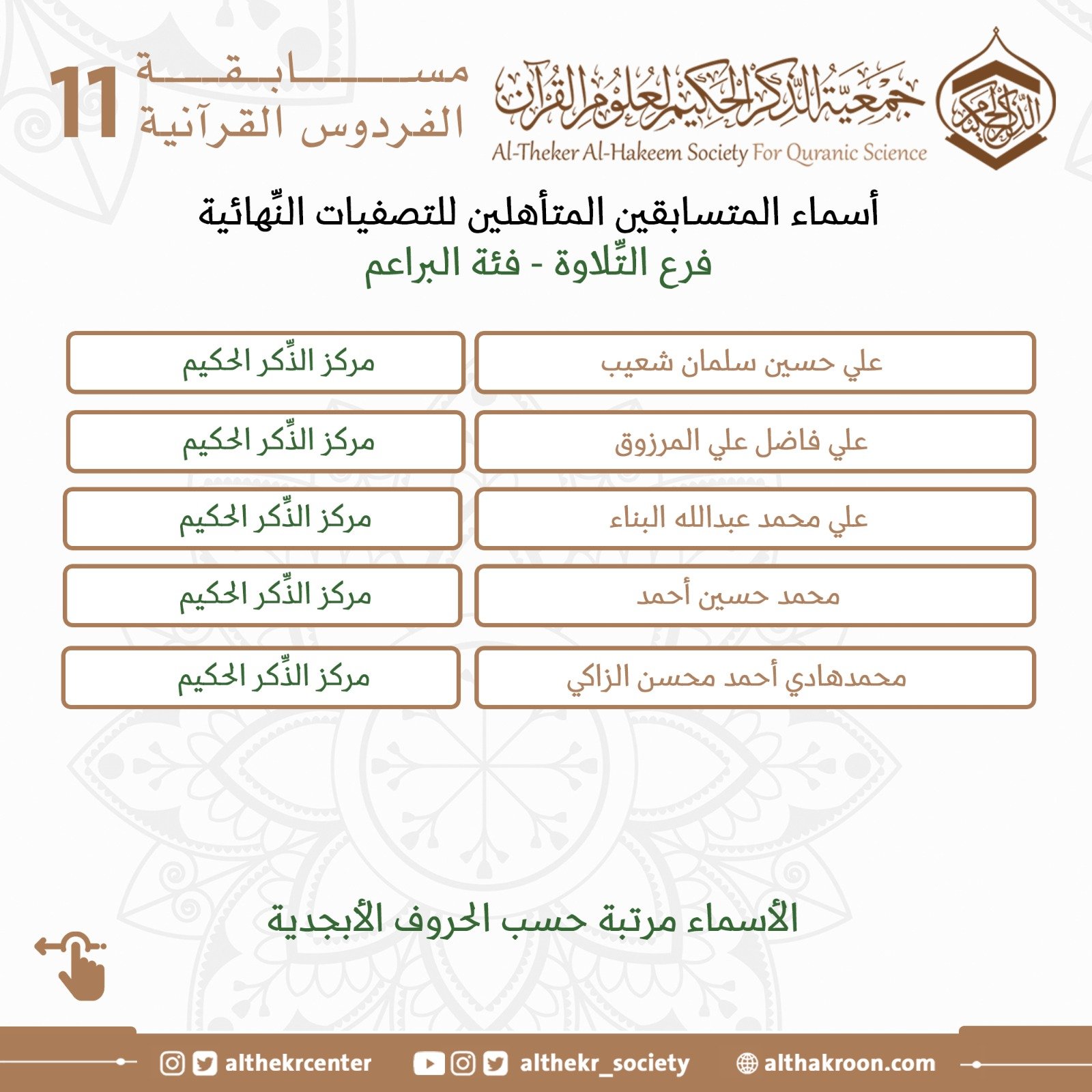 تضع لكم اللَّجنة الإعلاميَّة لمركز الذِّكر الحكيم لعلوم القرآن أسماء المتأهلين للتصفيات النِّهائيَّة لمسابقة الفردوس الحادية عشرة