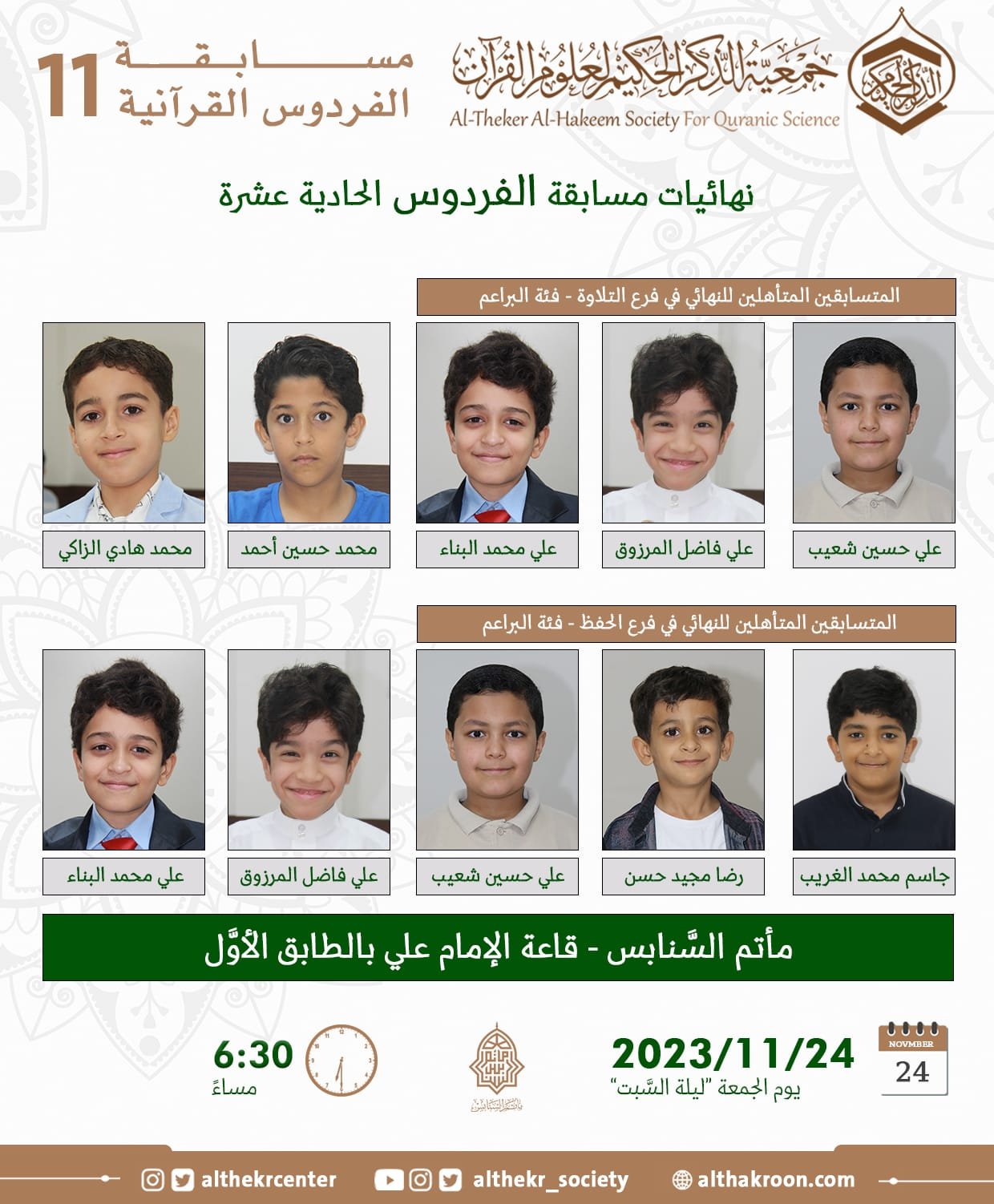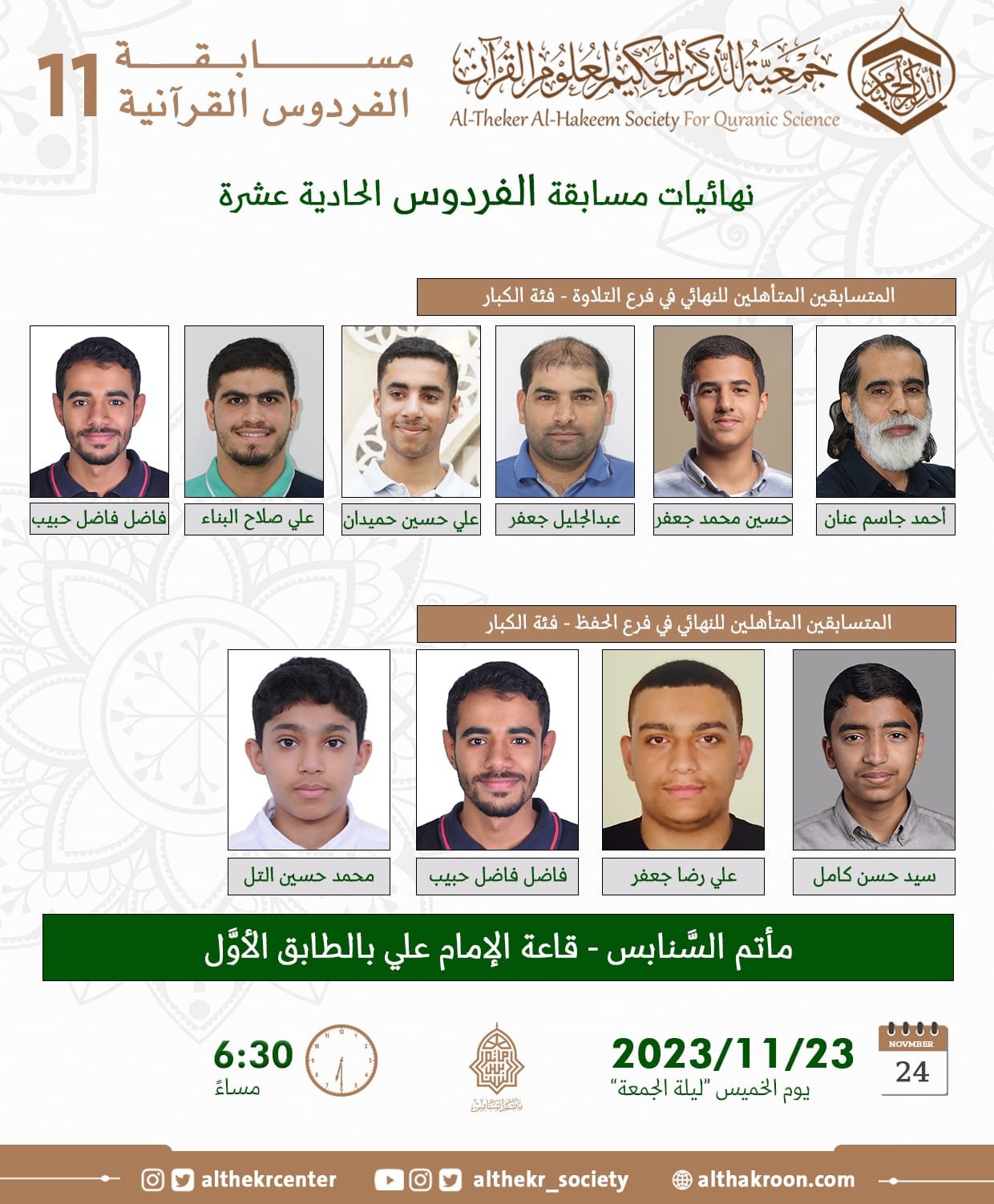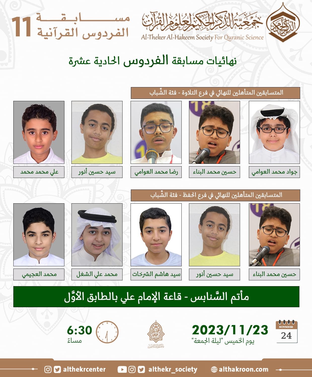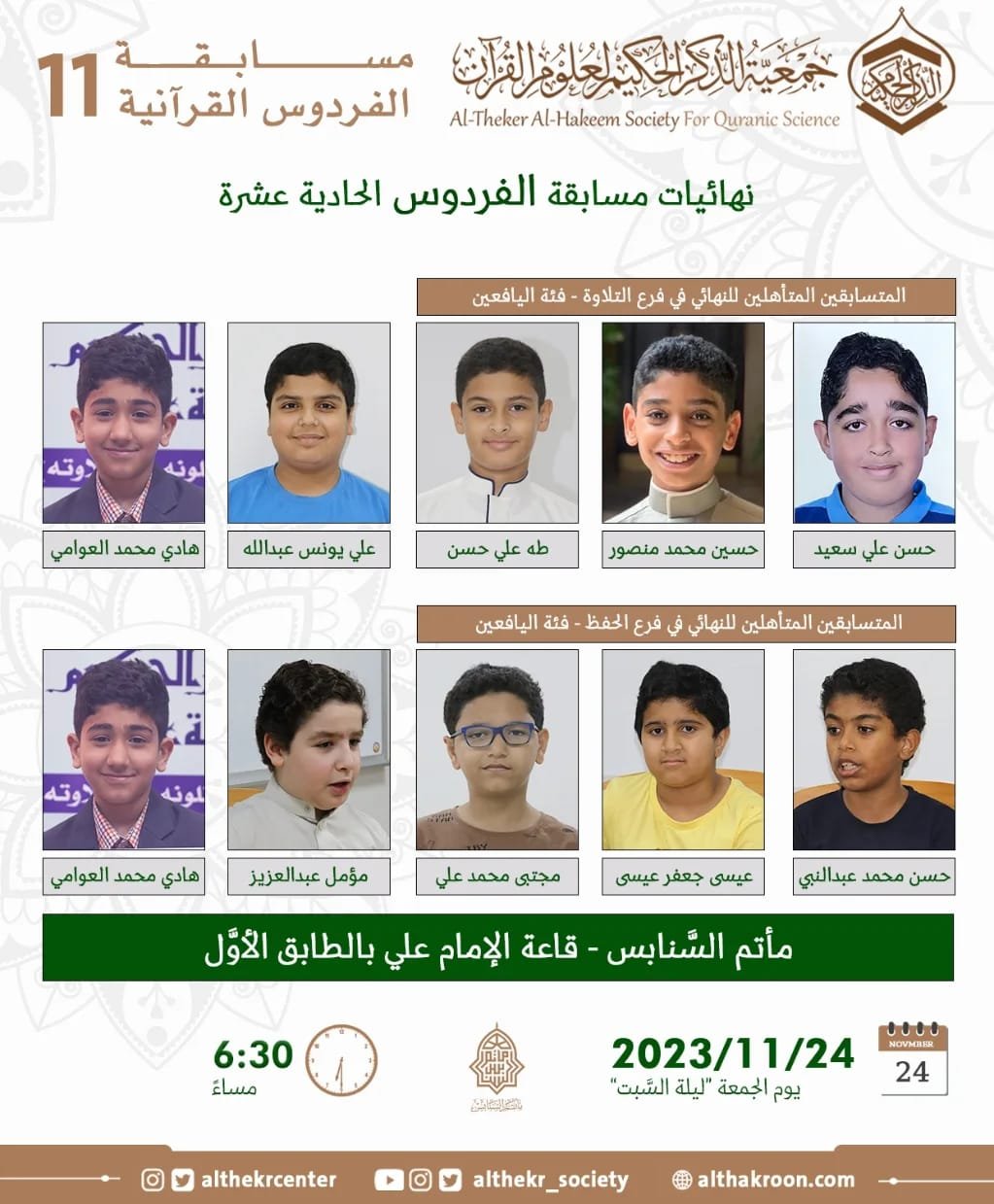 تقدِّم لكم اللَّجنة الإعلاميَّة مواعيد التَّصفيات النِّهائيَّة وحفل التَّكريم وإعلان النتائج لمسابقة الفردوس الحادية عشرة