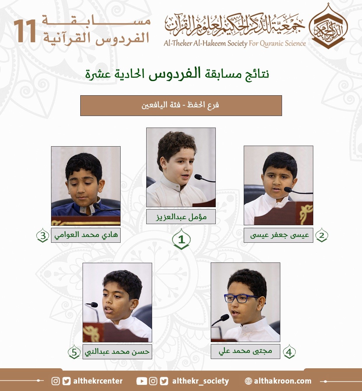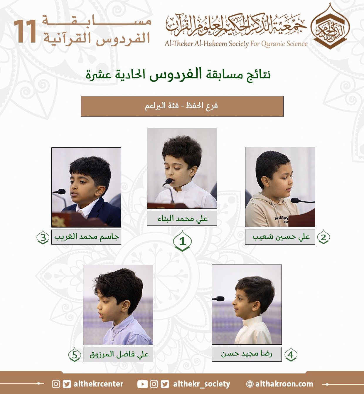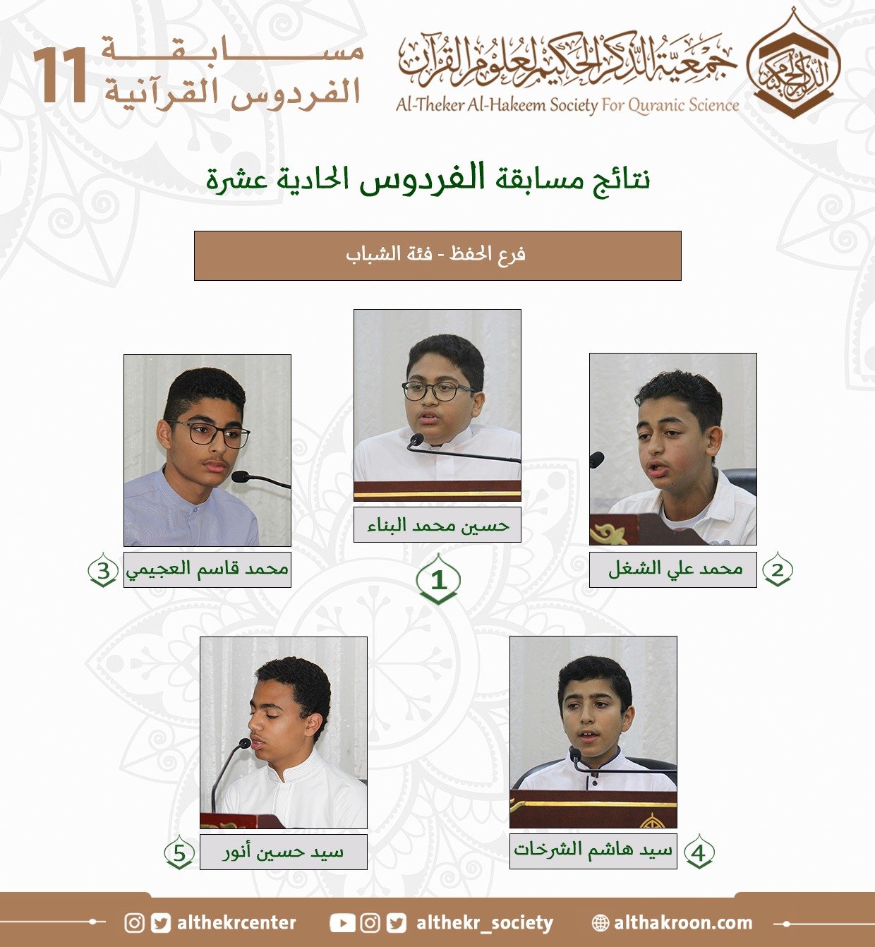 تقدِّم لكم اللَّجنة الإعلاميَّة بمركز الذِّكر الحكيم نتائج مُسابقة الفردوس الحادية عشرة والتي أقيمت في الفترة منذ 19 نوفمبر وحتى 25 نوفمبر 2023م
