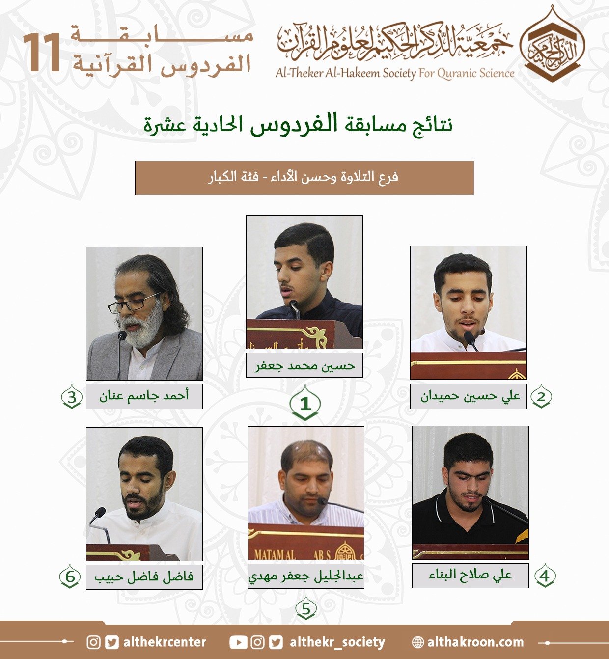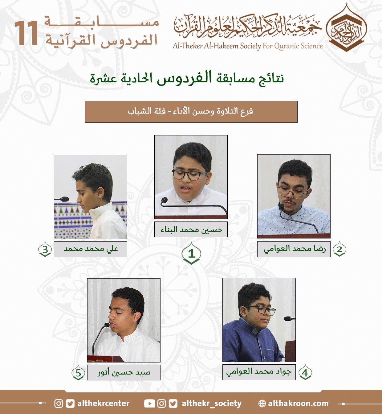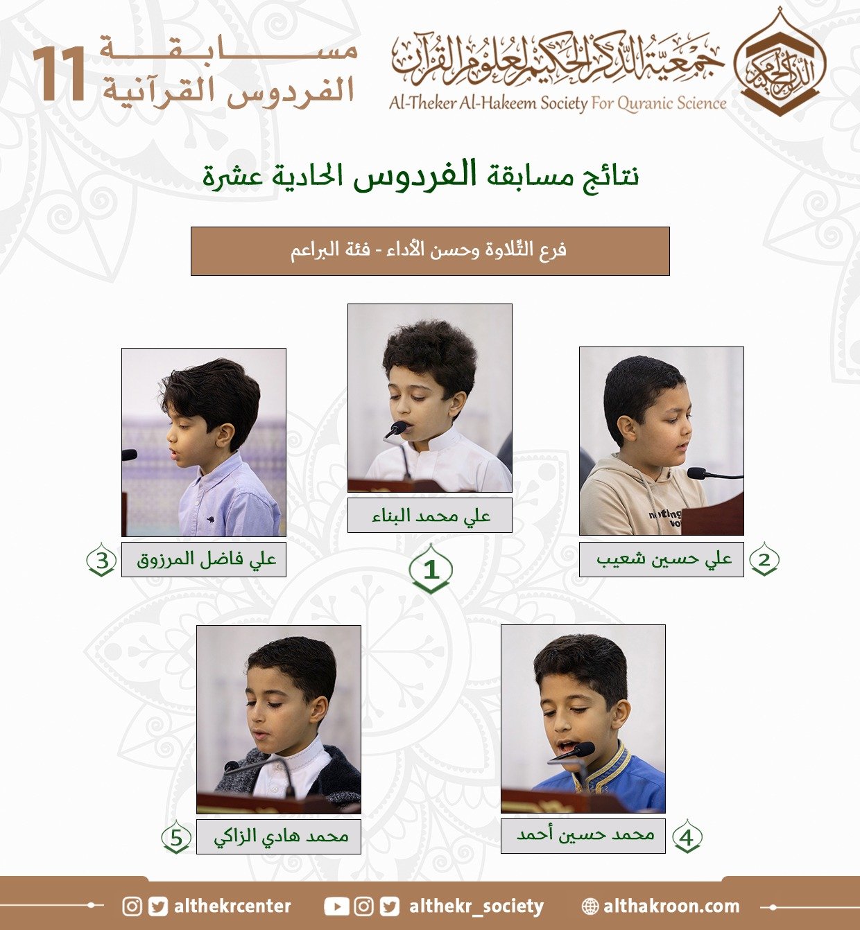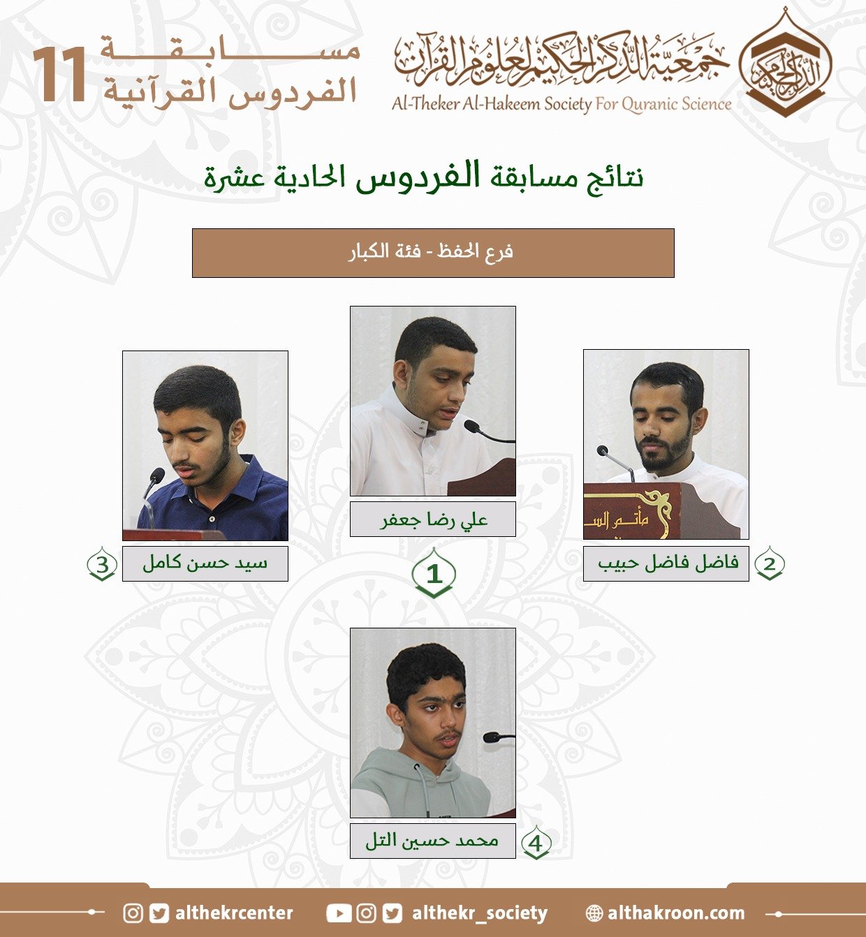 تقدِّم لكم اللَّجنة الإعلاميَّة بمركز الذِّكر الحكيم نتائج مُسابقة الفردوس الحادية عشرة والتي أقيمت في الفترة منذ 19 نوفمبر وحتى 25 نوفمبر 2023م