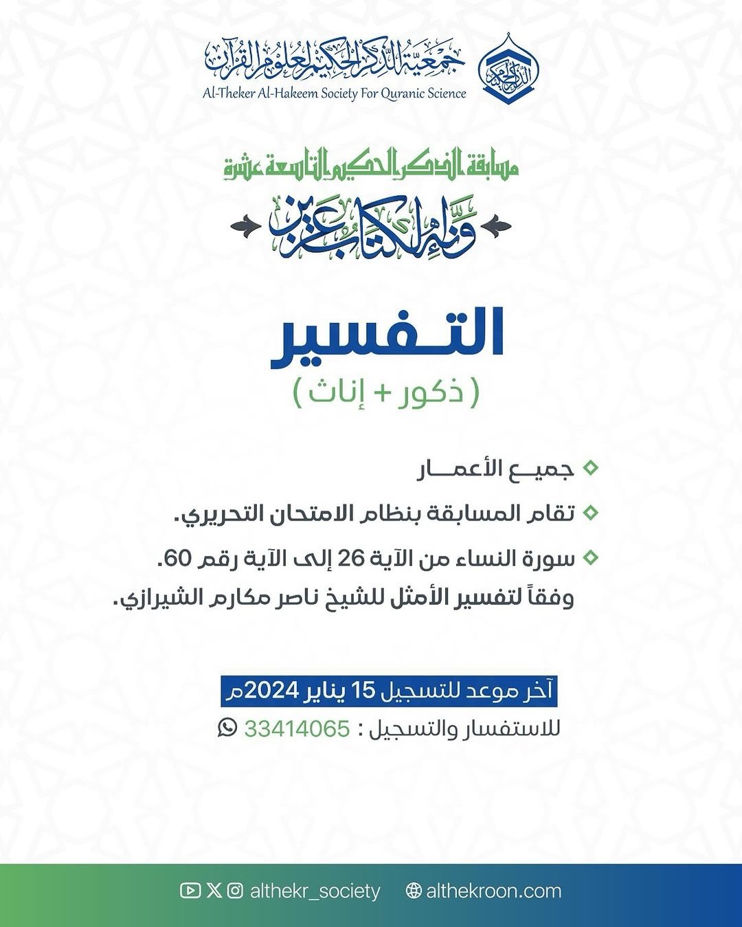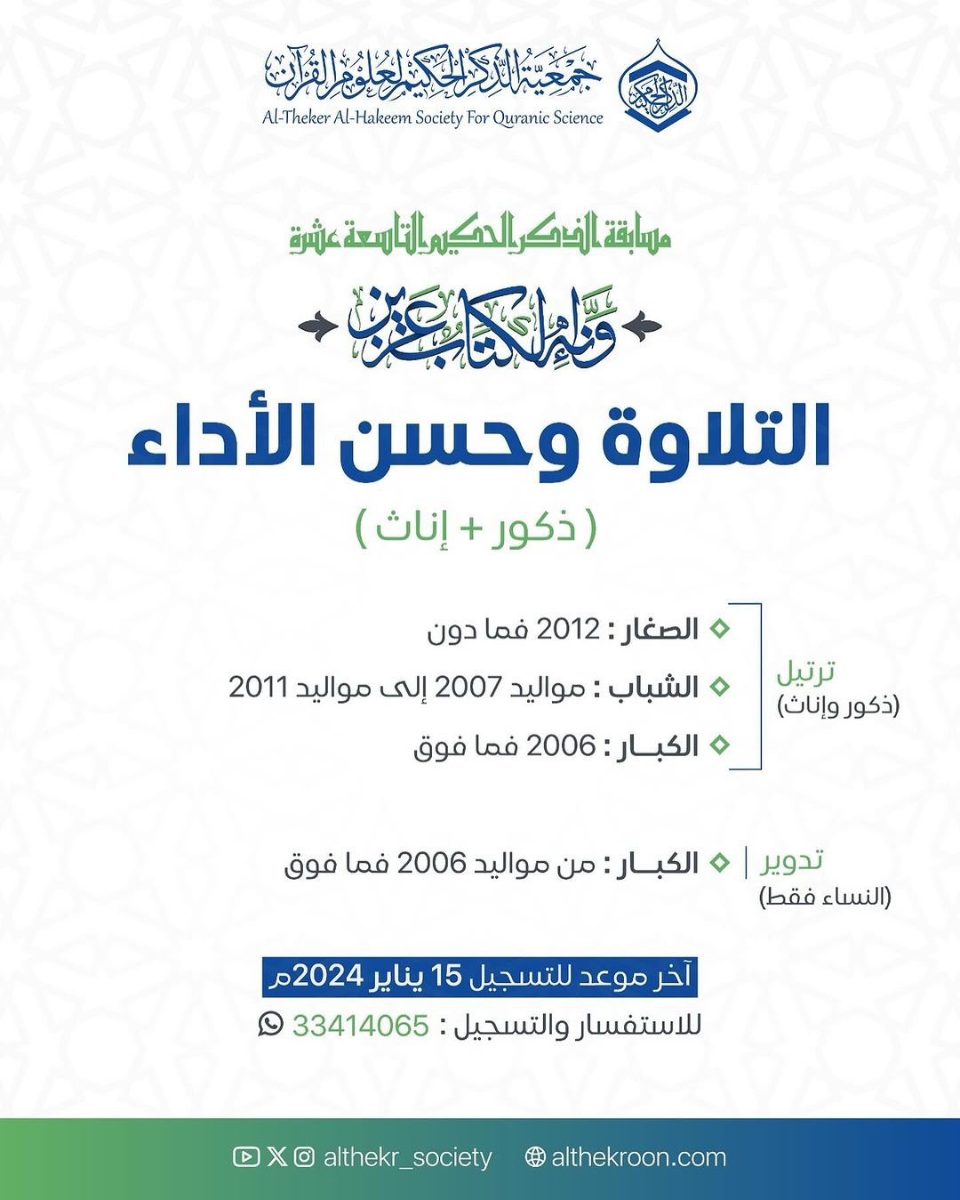 الذكر الحكيم 19 أعلنت لجنة التحكيم لفئة الذكور في مسابقة الذكر الحكيم 19 عن تأهل 29 متسابقًا (فرع الحفظ) من مختلف الأعمار يتنافسون